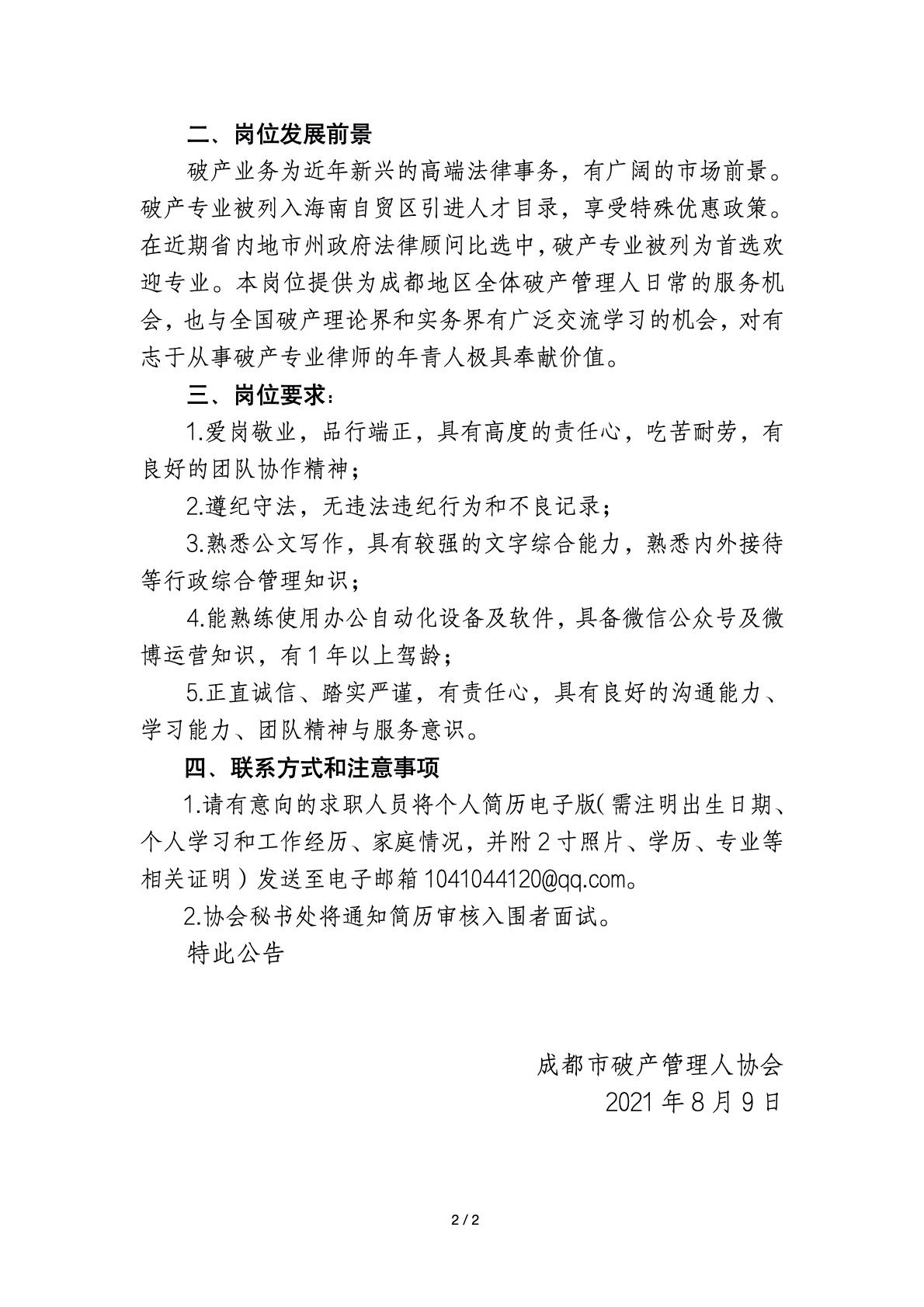 成都市破产管理人协会关于公开招聘协会专职秘书的公告