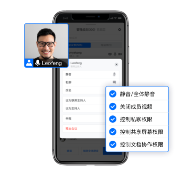支持设置联席主持人,一键管理成员音视频权限、协作权限,维持会场秩序